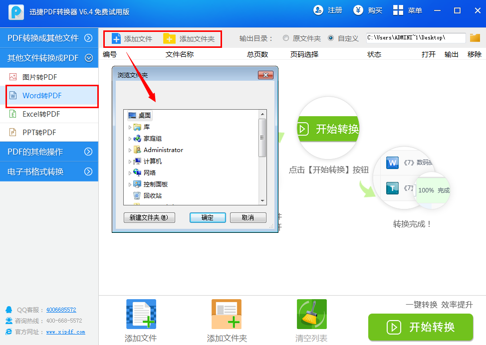 2、当我们选择好文档的转换格式后,可以添加文件了,点击软件上的“添加文件”按钮,在弹出的对话框中选择转换的文档即可。要是我们想要转换多个文档的话,还可以点击“添加文件夹”,实现多个文档的批量转换。