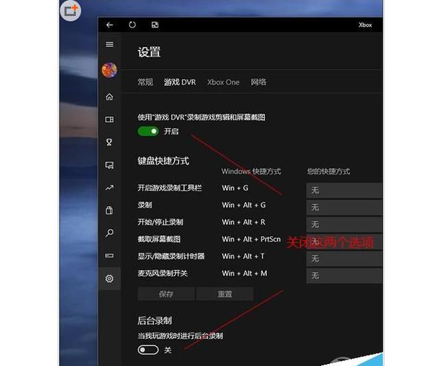Xbox是Win10的一项预设应用,它有一个很特别的功能——屏幕录制。其实,win10就是把这个功能给默认打开了,于是就造成出现这种情况,通过搜索功能放进去xbox——左侧栏→“设置”→“游戏DVR”,然后关闭“使用‘游戏DVR’,就可以关闭这两个功能了!如下图