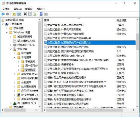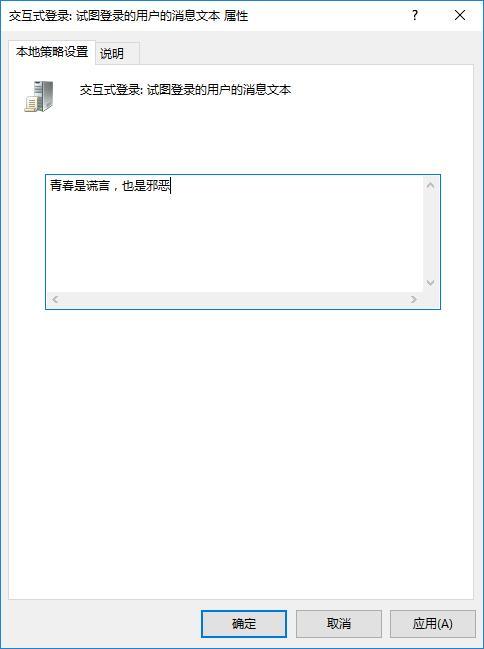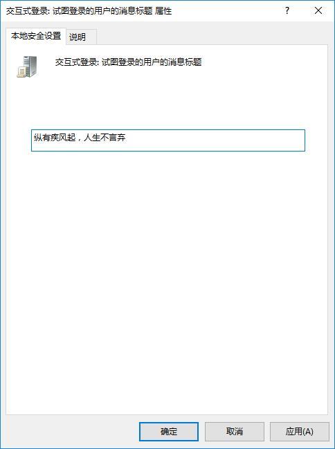 3、在右侧找到并打开“交互式登录:试图登录的用户的消息文本”和“交互式登录:试图登录的用户的消息标题”,输入想要显示的开机问候语,应用并确定即可。