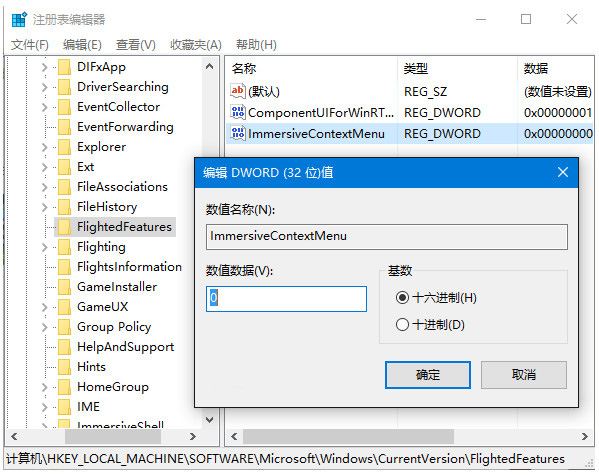 3、在右边新建DWORD(32位)值,重命名为ImmersiveContextMenu,数值数据直接使用默认的“0”,不必修改,如下图——