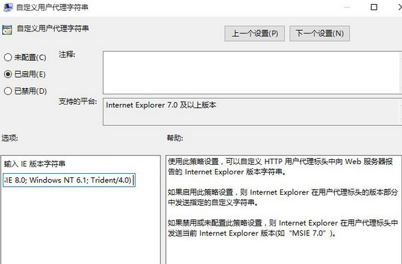 3、弹出窗口中,点击已启用,在下方输入ie版本字符串中输入“Mozilla/4.0 (compatible; MSIE 8.0; Windows NT 6.1; Trident/4.0) ”,点击确定即可,如下图所示: