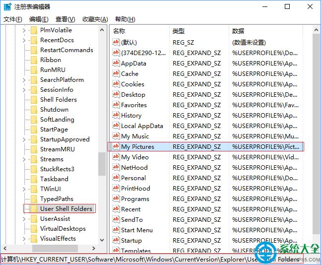 2、定位到“HKEY_CURRENT-USER\Software\Microsoft\Windows\CurrentVersion\Explorer\User Shell Folders””,点击“My Pictures”,在“数值数据”中输入“%USERPROFILE%Pictures”,将图片保存路径更改为自己当前所用的图片库对应的真实位置路径即可。