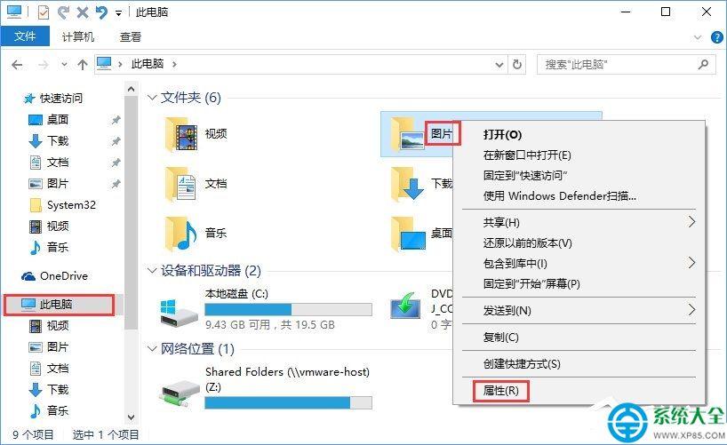 3、我们也可以不用更改注册表信息,转而通过修改“图片”库属性来恢复图片保存路径,让截图工具路径保存恢复正常。使用【Win+E】组合键启动资源管理器,在左侧栏导航窗格中定位到【此电脑→图片】,右键单击【图片】并选择【属性】命令,弹出【图片 属性】对话框,切换到【位置】选项卡,在其中点击【还原为默认值】,并依次点击【应用】、【确定】,即可恢复抓图保存默认路径。