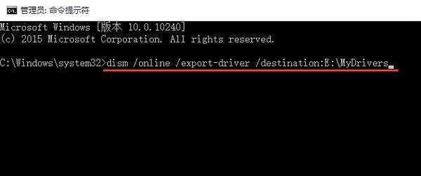 2、点击调出管理员命令提示符窗口后,接着输入dism /online /export-driver /destination:E:\MyDrivers并按回车,如图: