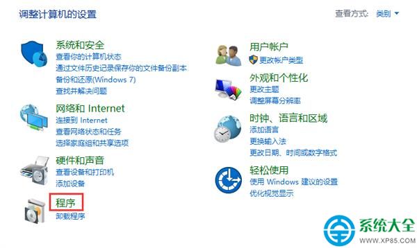 2、调出控制面板窗口后,点击程序选项,如图所示: