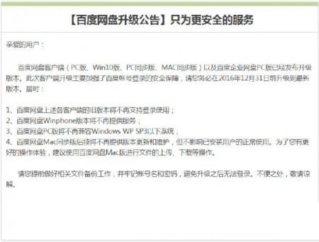 百度网盘官微发布公告,通知用户务必在2016年12月31日前升级到最新版本,届时旧版本将不再支持登录使用。本次升级涉及到的客户端包括百度网盘客户端(PC版、Win10版、PC同步版、MAC同步版)以及百度企业网盘PC版。此次发布升级的理由是“只为更安全的服务。”