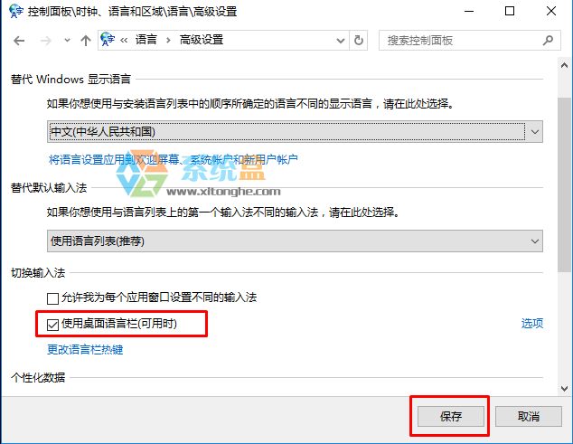 4、勾选“使用桌面语言栏(可用时)”选项,然后再点击保存;