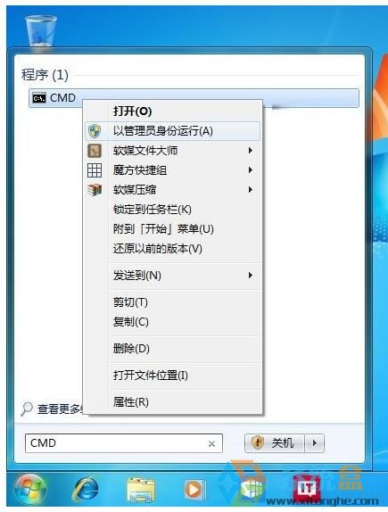 ① 在搜索框中输入CMD后,选择第一个结果,并在上面单击右键选择“以管理员身份运行”,如下图——