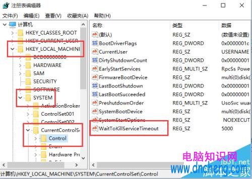 2、在弹出的“注册表编辑器”窗口中, 依次点击文件夹定位到“HKEY_LOCAL_MacHINE/SYSTEM/CurrentControlSet/Control”项目中的“WaitToKillServiceTimeOut”。如图所示;