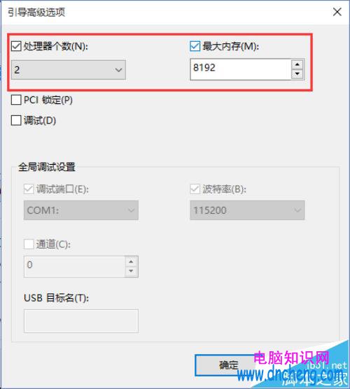 3、在弹出的“引导高级选项”窗口界面中,把“处理器数(N)”选项勾选上并把它的数值设为2、然后再把“最大内存(M)”选项也勾选上(然后系统会自动识别当前用户使用的内存大小)。设置好以后在点击“确定”。如图所示;