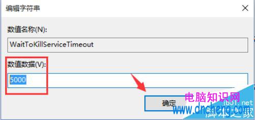 3、鼠标双击“WaitToKillServiceTimeOut”选项,在弹出的“编辑器字符串”窗口中将“WaitToKillServiceTimeOut”的”数值数据“改为”5000“,然后再点击“确定”按钮。如图所示;