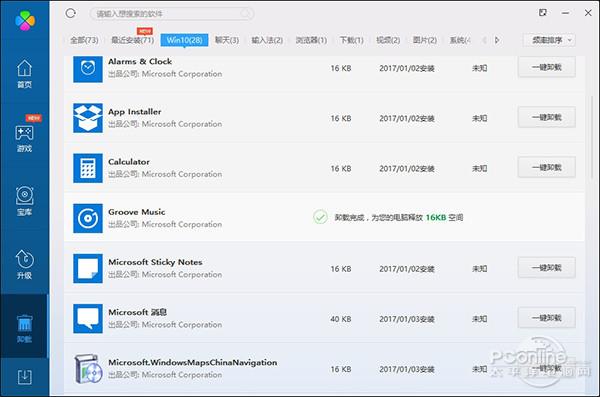 3、找到需要卸载的APP,比如Groove。点击其右侧的“一键卸载”按钮,直接将其卸载;