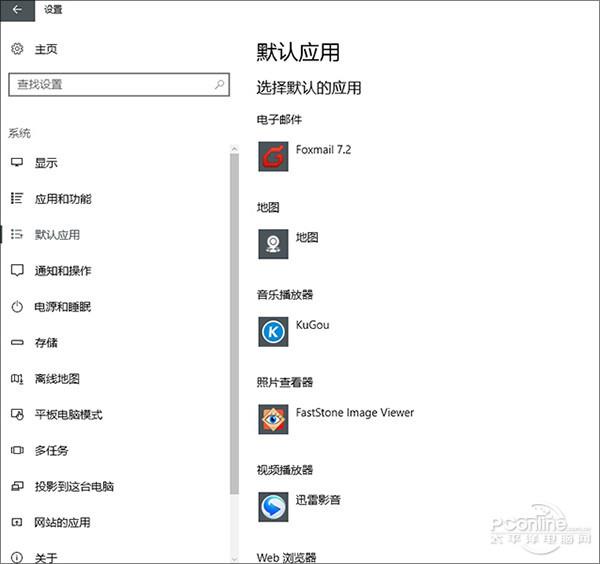5、点击“开始菜单”→“设置”→“系统”→“默认应用”,将系统默认关联设置到自己安装的第三方软件上,如“酷狗”、“暴风影音”、“Foxmail”等;