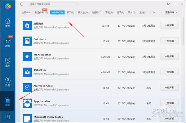 2、点击“软件管理”→“卸载”→“Win10”,进入Win10内置应用卸载页面;