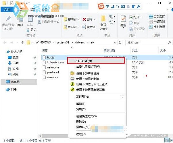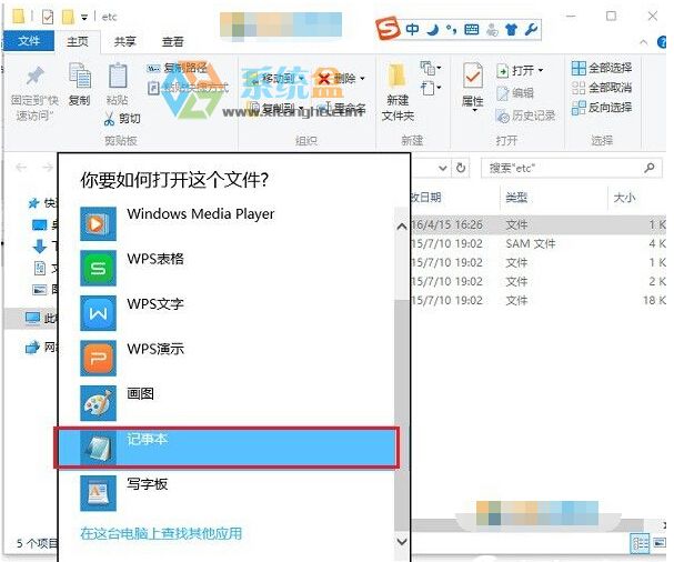 2、打开etc文件夹后,在 hosts 文件夹上右键,然后点击“打开方式”,之后再选择使用“记事本”方式打开,如下图所示。