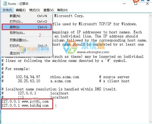 127.0.0.1 + 需要屏蔽的网址,或0.0.0.0 + 需要屏蔽的网址 (前面的IP地址和右侧网址之间用空格隔开)。按照下面格式添加进去,然后保存即可,(如果无法保存,那么需要先获取host文件的权限Win10系统hosts文件修改后无法保存怎么办?)