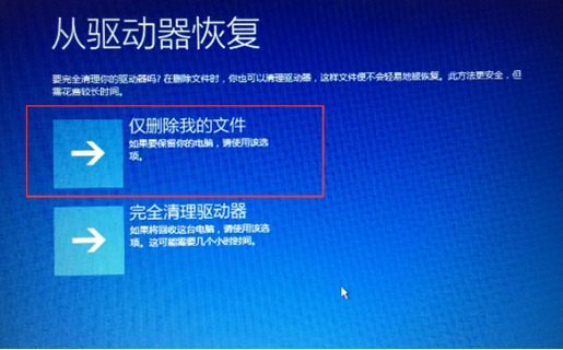 6、可根据需要选择“完全清理驱动器”或“仅删除我的文件”,来决定操作过程中是否会进行格式化操作,此文档选择的是“仅删除我的文件”。