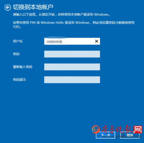 这回,就可以设置本地账户用户名和密码了,当然,像小编一样懒得设置密码的也可以直接点击下一步跳过。