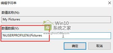 3、接着在打开的界面中,将数值数据改为“%USERPROFILE%Pictures”,点击确定,如下图所示: