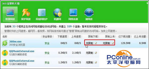 3、在【管理网速】界面,我们可以看到当前系统中所有占网速的程序,我们可以点击对应软件“限制下载”下的“无限制”,将其设置为合适的大小即可。 ( 一般不推荐设置不小于50Kb),然后将后面“限制上传”大小进行修改,推荐设置20kb以下。
