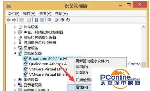 从打开的“设备管理器”窗口中,展开“网络适配器”列表,从中找到无线网卡型号并右击,从其右键菜单中选择“属性”项。