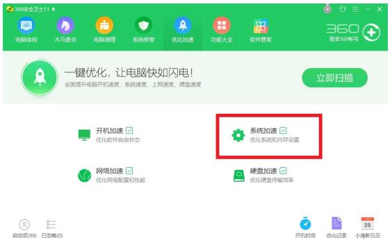 打开“360安全卫士”——“优化加速”界面,确保勾选“系统加速”项,点击“立即扫描”按钮。待扫描完成后,勾选需要进行优化的选项,就可以完成内存的释放以及开机加速、网络优化等功能。