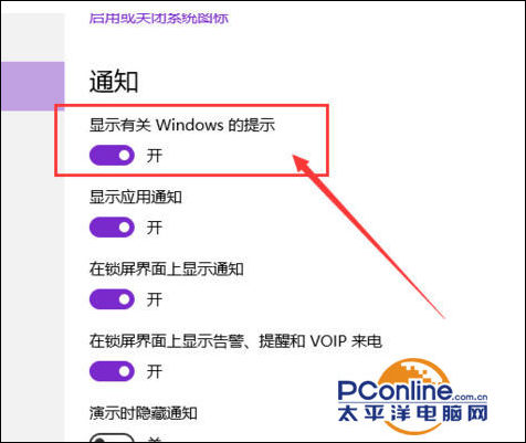 在通知栏设置页面中,我们需要关闭Windows系统的提示开关,因为来自Win10系统自身的通知都有可能会占用不少的CPU。