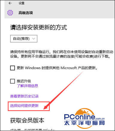 在系统更新设置页面中,点击Windows更新选项,然后点击”高级选项“设置,点击”选择如何提供更新“按钮功能。