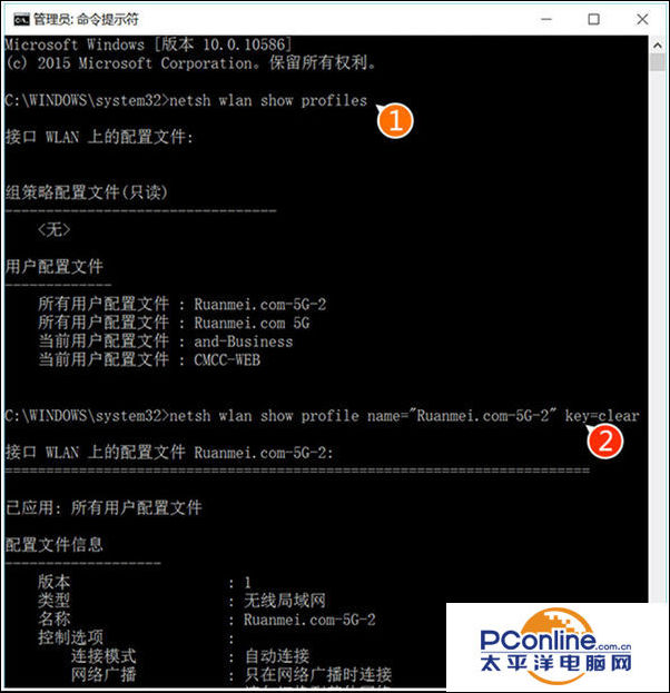 3、在给出的曾经使用过的WiFi连接中选择你想查询的连接名称,然后套入如下命令(上图②号命令)中查询密码: