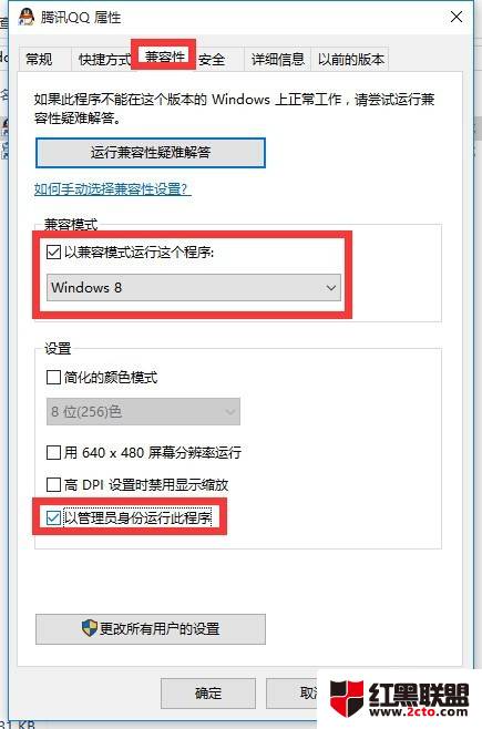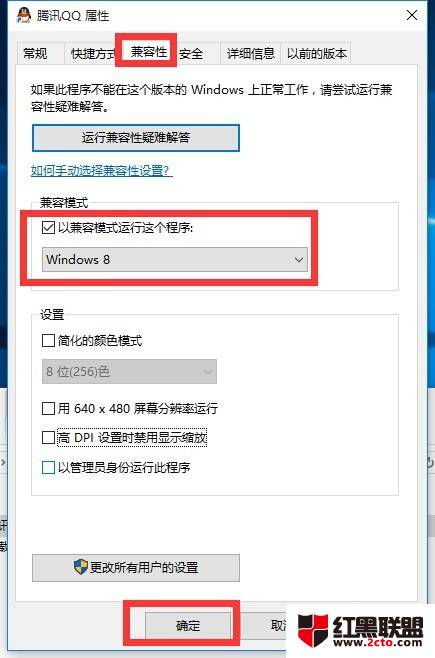 从打开的“腾讯QQ 属性”窗口中,切换到“兼容性”选项卡,勾选“以兼容模式运行这个程序”项,同时设置相应的系统(通常可选择Windows8),点击“确定”按钮。