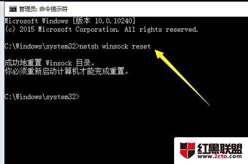 从打开的MSDOS窗口 中,输入命令“netsh Winsock reset”,并按回车以重置Winsock目录。最后重启一下计算机。