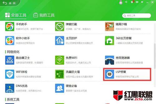 打开“360安全卫士”程序,在“更多功能”列表中找到“LSP修复”工具点击运行。