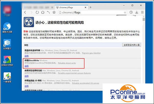 打开浏览器,在地址栏中输入chrome://flags/回车,在打开的页面中找到停用DirectWrite,点击下面的“启用”,然后重启浏览器即可禁用DirectWrite字体渲染系统。