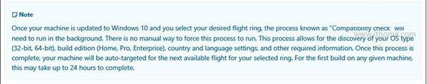 微软的一个说明文档解释了其中的奥秘。当用户切换版本接收通道后,“兼容性检查”进程将会在后台运行,但并不能手动强制运行。该进程会检查当前系统版本信息,包括体系结构(32/64位)、版本类型(家庭版、专业版和企业版等)、语言版本和其他必要信息。当该进程检测完这些所需信息后,将会自动为系统匹配合适的推送版本。一般来说,这一过程将持续数小时,最长大约需要一天时间。