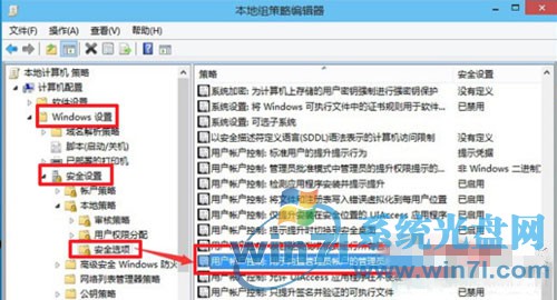 2、在弹出的本地组策略编辑器对话框左侧依次点击【计算机配置】→【Windows设置】→【安全设置】→【本地策略】→【安全选项】下,在右侧找到【用户账户控制:用于内置管理员账户的管理员批准模式】(系统默认为【禁用】)。