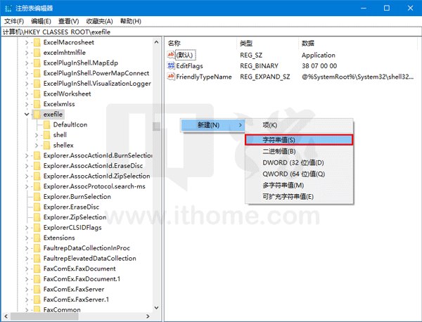 3、双击右侧的“(默认)”,复制数值数据“exefile”,如下图 ——