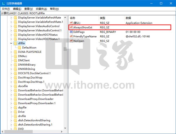 IT之家提示2:可看到动态链接库文件.dll文件也依然显示,按照上述方法定位到注册表相应位置会发现,HKEY_CLASSES_ROOT\dllfile下也有AlwaysShowExt值,因此这是系统默认始终显示.dll的原因。