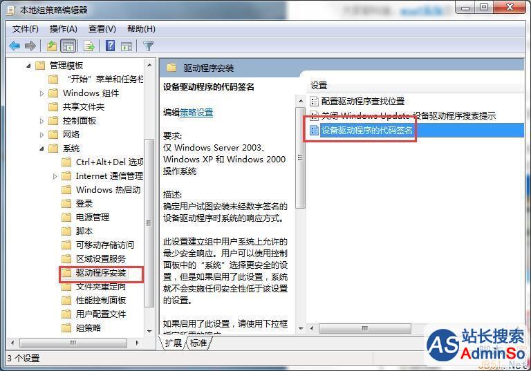 2、在组策略编辑器中依次打开用户配置→管理模版→系统→驱动程序安装,在右侧找到“设备驱动程序的代码签名”,双击打开其设置。