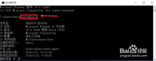 然后在命令提示符中输入命令systeminfo【系统信息】,然后回车运行命令。
