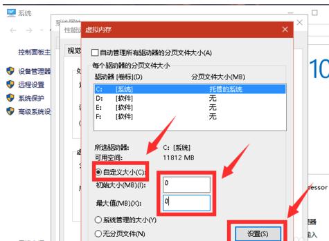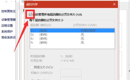 进入虚拟内存窗口后,把自动管理所有驱动器的分页文件大小,左侧复选框中的勾去掉。