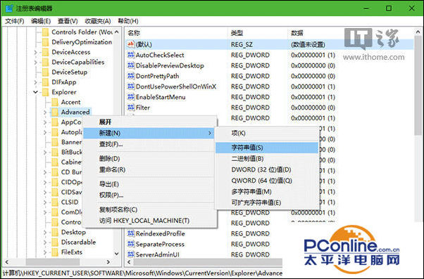HKEY_CURRENT_USERSoftwareMicrosoftWindowsCurrentVersionExplorerAdvanced