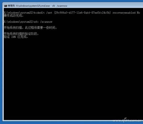 接着输入“bcdedit /set {GUID} recoveryenabled No”后回车,目的是禁用Windows的自启修复功能,其中{GUID}就是上面resumeobjec选项显得的一长串字符,可以直接复制粘贴,每台电脑GUID都不一样,小编就只能用这样的方式标注了!