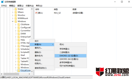 选中CloudContent项,在右侧新建名为DisableWindowsConsumerFeatures的DWORD(32位)值,如下图所示:
