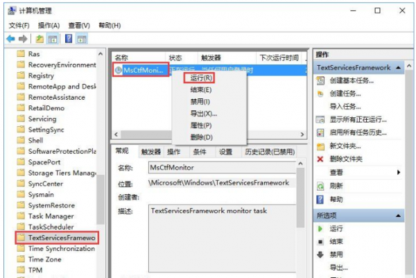 2、在计算机管理的系统工具——任务计划程序——任务计划程序库——Microsoft——Windows中找到TextServicesFramework,如下图所示,在右侧可以看到名为MsCtfMonitor的任务计划程序,右键单击MsCtfMonitor,选择“运行”即可。