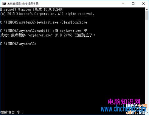 3、输入taskkill /IM explorer.exe /F回车将桌面关闭。