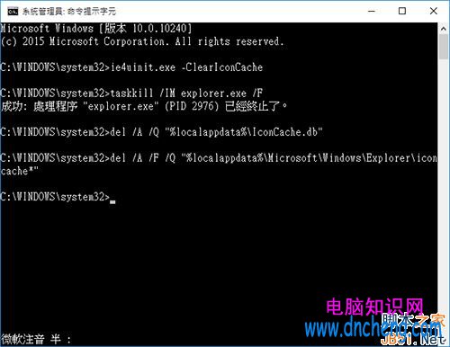 5、接下来输入del /A /F /Q “%localappdata%\Microsoft\Windows\Explorer\iconcache*”回车即可。