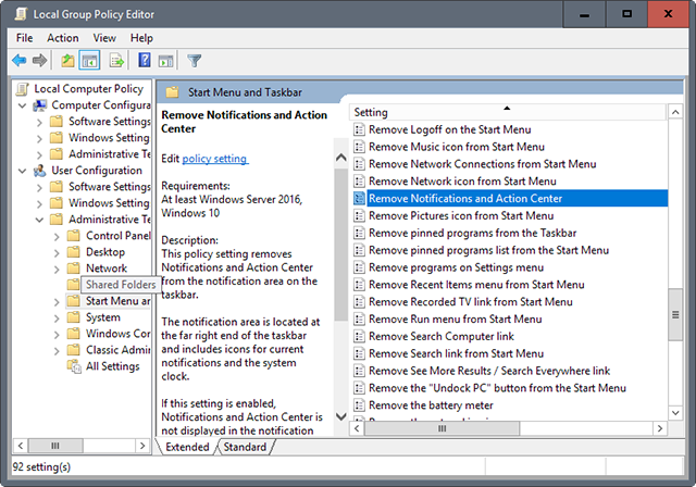 他的策略设置从任务栏上的通知区域中移除通知和操作中心。