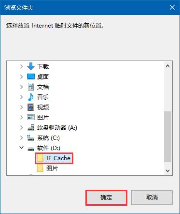 5、在浏览文件夹窗口中,选择刚才新建的 IE Cache 文件夹,点击确定,