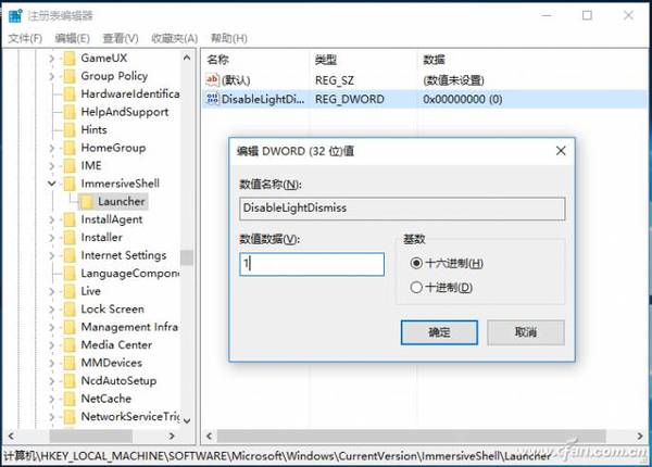 在右侧新建个名为“DisableLightDismiss”的DWORD(32位)值,数值数据设置为1。