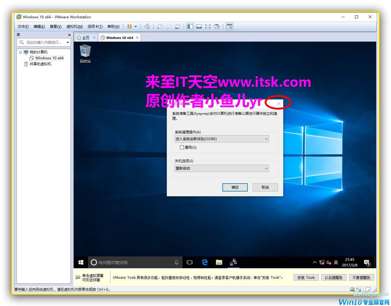 下面开始吧,下图这个对话框每次启动WIN10虚拟机都会出现,只有在封装好系统后才会消失,在上一个系列已经解释过,每次点X即可。